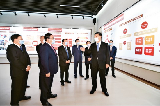 2020年11月12日,浦東開發(fā)開放30周年慶祝大會在上海市舉行。中共中央總書記、國家主席、中央軍委主席習(xí)近平在會上發(fā)表重要講話。這是當(dāng)天上午,習(xí)近平等參觀“在國家戰(zhàn)略的引領(lǐng)下——浦東開發(fā)開放30周年主題展”。 新華社記者 殷博古/攝